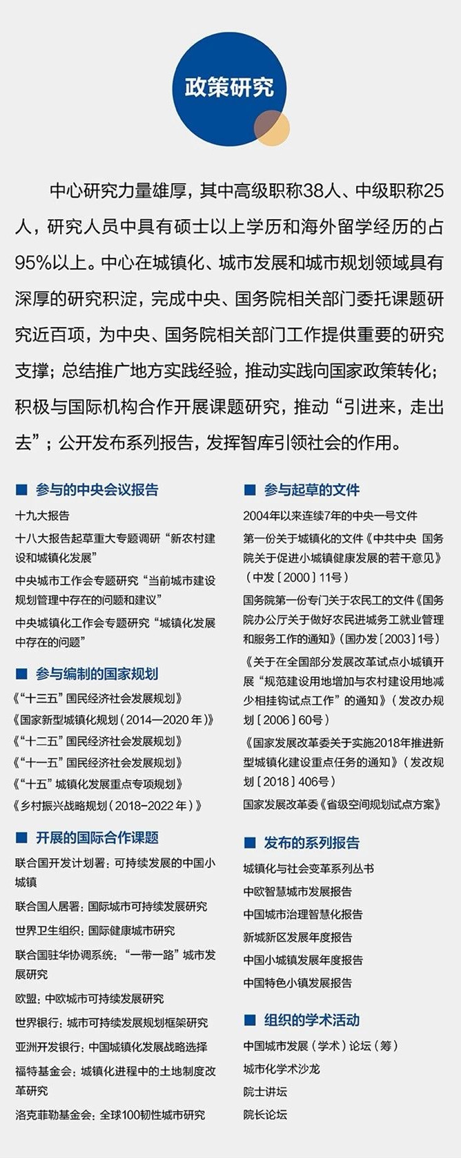 中國城市和小城鎮(zhèn)改革發(fā)展中心,成立于1998年,主要承擔(dān)城鎮(zhèn)化、城市發(fā)展、城鄉(xiāng)融合及相關(guān)領(lǐng)域的政策研究和決策咨詢工作,為中央、國務(wù)院相關(guān)政策文件制定和規(guī)劃編制提供研究支撐,為全國城市和小城鎮(zhèn)發(fā)展提供政策咨詢服務(wù),為全國城市和小城鎮(zhèn)發(fā)展編制各類規(guī)劃,為城市間國際合作、智慧城市建設(shè)、城鎮(zhèn)化新媒體宣傳推廣、文化體育交流、城市多樣化融資搭建專門平臺,是專注于城鎮(zhèn)化、城市發(fā)展和城市規(guī)劃問題的高端智庫。
